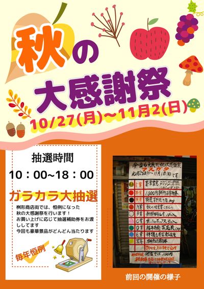 秋の大感謝祭を開催します! 2025年10月17日 イベント 桝形商店街では、10月27日(月)~11月2日(日)の間お買い上げに応じて抽選補助をお渡ししてます。 今回も豪華景品がどんどん当たりますので是非ご参加下さい! シェアする SHARE